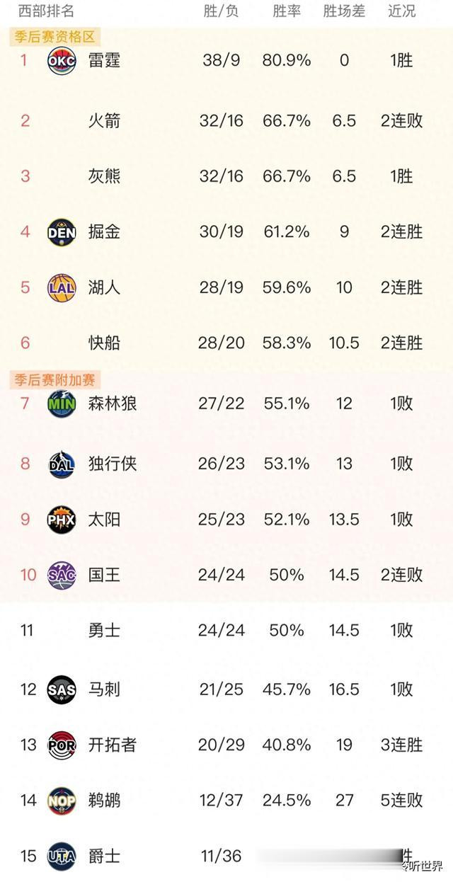 NBA西部最新名次,就在今天定约倒数第一的奇才爆冷打败丛林狼,开采者拿下太阳,掘金险胜黄蜂迎来两连胜,沿途望望比赛冒失以及名次齐有哪些变化。