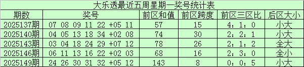 大乐透上周星期一第2025149期开奖,前区:24、26、30、31、32;后区:05、12。其中前区三区比为0:0:5,大小比为5:0,奇偶比为1:4体育集锦,后区开出一大一小组合。