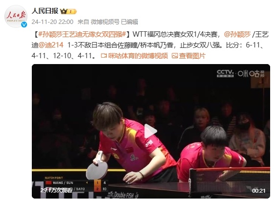WTT福冈总决赛女双1/4决赛,孙颖莎 /王艺迪1-3不敌日本组合佐藤瞳/桥本帆乃香,停步女双八强。比分:6-11、4-11、12-10、4-11。