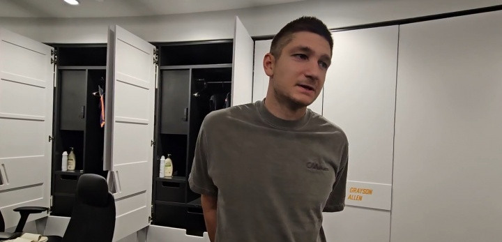 直播吧12月15日讯NBA惯例赛,太阳114-116不敌湖东说念主。赛后,太阳球员格雷森·阿伦在更衣室禁受了记者的采访。