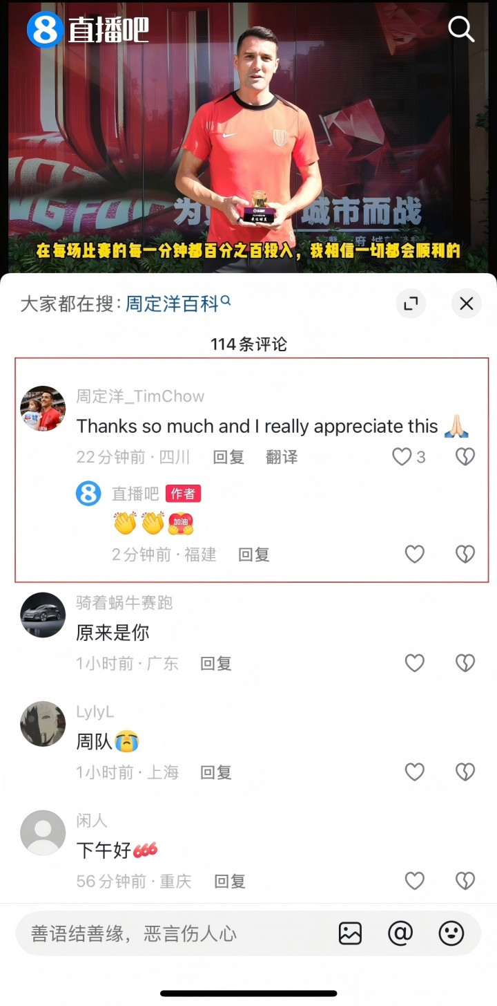 当选直播吧中超最好&收到个东说念主海报, 周定洋社媒批驳: 终点感谢体育最新信息